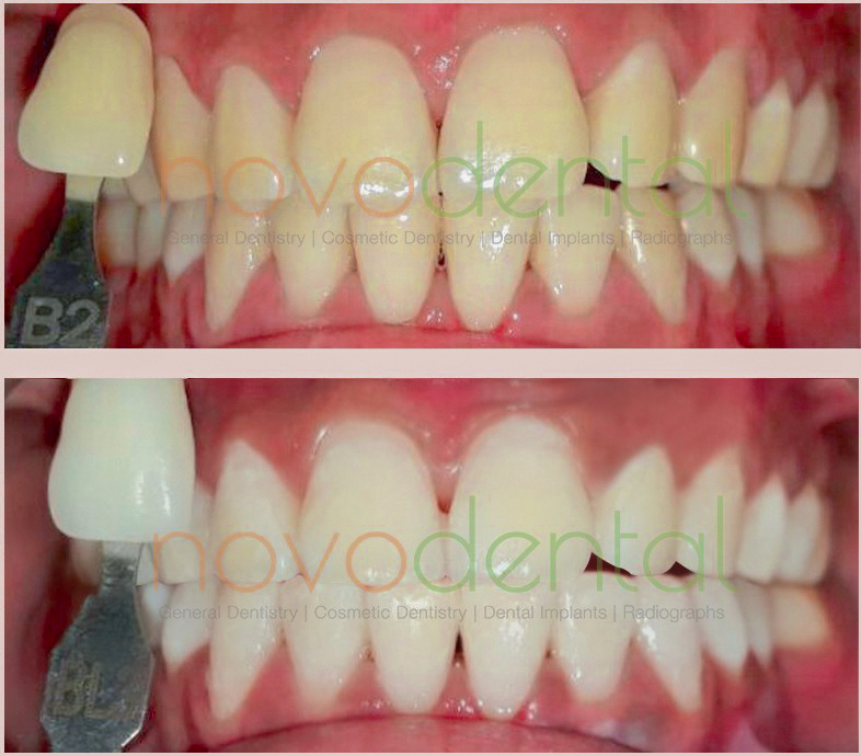 Removal of surface and deep stains on teeth through bleaching that uses blue light technology that activates a specially formulated gel to whiten teeth which causes the teeth to become lighter than their natural shade.